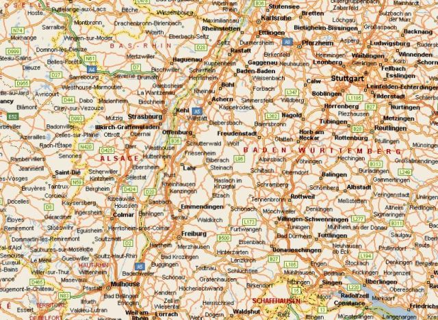| Hier sieht man mobile Stationen mit Icons und Feststationen mit einem Haus ,Gebiet Deutschland-FrankreichSchweiz |