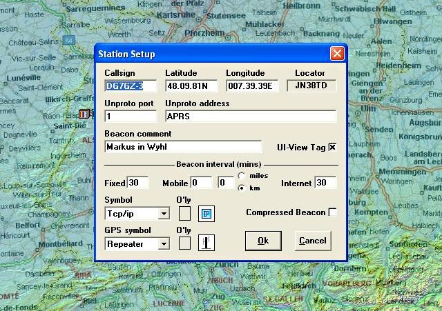 | In diesem Menüpunkt sollte das eigene Rufzeichen sowie die gps-Qoordinaten eingegeben werden .Unter Beacon Comment kann man einen eigenen Text eingeben |