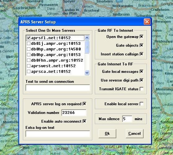 | im APRS Server Setup kann man die Daten auch übers Internet abrufen ,dazu muß man nur ein häckchen im dementsprechenden Server machen und einfach auf Action Connect to APRS Server |