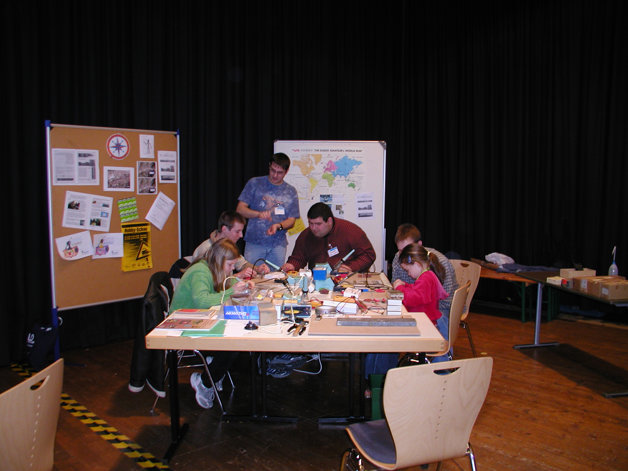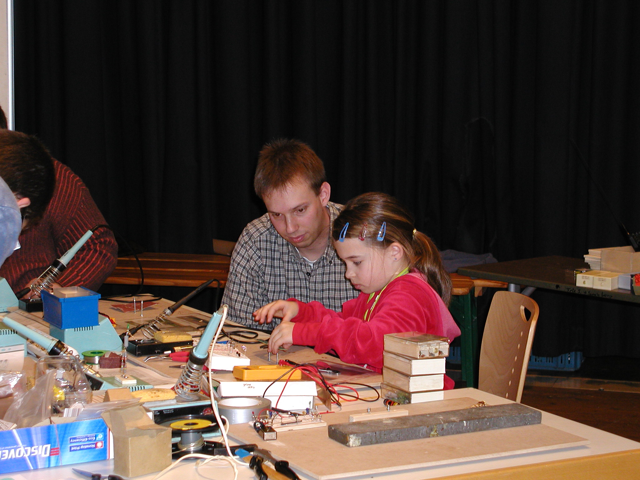DO3GBA mit einem Kind beim basteln der Led-Taschenlampe |