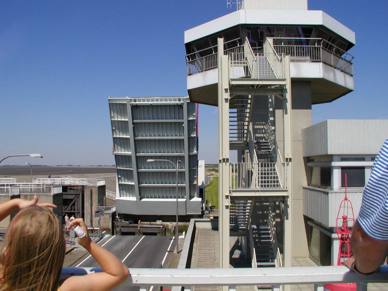Zugbrücke am Eidersperrwerk halb geöffnet,diese Bücke muß geöffnet werden sonst können keine Schiffe hindurch fahren |